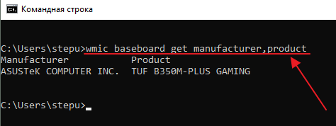 После открытия «Командной строки» введите команду «wmic baseboard get manufacturer,product» и снова нажмите клавишу ввода. В результате в командной строке появится информация из которой вы сможете узнать производителе вашей материнской платы (Manufacturer), а также ее точное название (Product). На скриншоте внизу видно, что используется материнская плата TUF B350M-PLUS GAMING, от производителя ASUS. Данная команда одинаково хорошо работает как в Windows 7, так и в Windows 10. Поэтому можете использовать ее в любой из этих операционных систем.