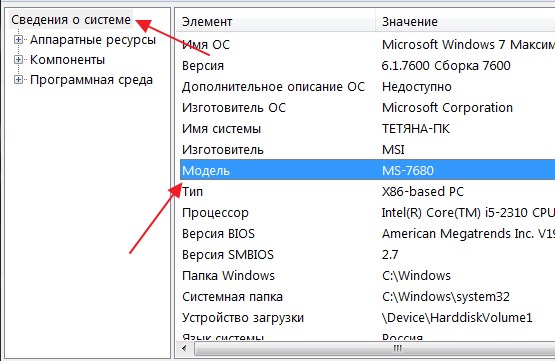 После этого нужно выбрать раздел «Сведения о системе» и посмотреть параметры «Изготовитель» и «Модель». Здесь должен быть указан производитель материнкой платы, а также ее точное название.