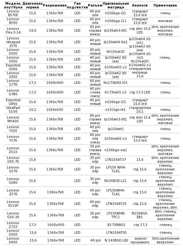 В приведенной таблице представлены модели и характеристики матриц, установленных в ноутбуках Lenovo. В таблице представлены аналоги, которыми можно 100% заменить оригинальную матрицу в Lenovo. Раздел постоянно обновляется и пополняется.