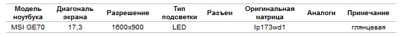 | MSI GE70 | 17,3 | 1600х900 | LED | lp173wd1 | глянцевая |