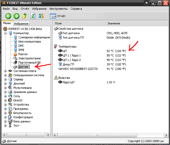 В левом окне откройте вкладку Компьютер и выберите элемент Датчик. В правом окне посмотрите температуру ЦП. Если она больше 70 градусов, то скорее всего имеет место перегрев. Для точного определения необходимо загрузить процессор и отследить рост температуры.