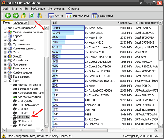 Откройте вкладку Тест в левом окне и выберите тест FPU Julia. Для запуска теста нажмите кнопку Обновить на верхней панели инструментов. Проведите тест несколько раз. После каждого раза отслеживайте температуру процессора. Если температура резко вырастет до 85-100 градусов и очень медленно будет падать, причиной того, что компьютер выключается сам по себе является перегрев процессора.