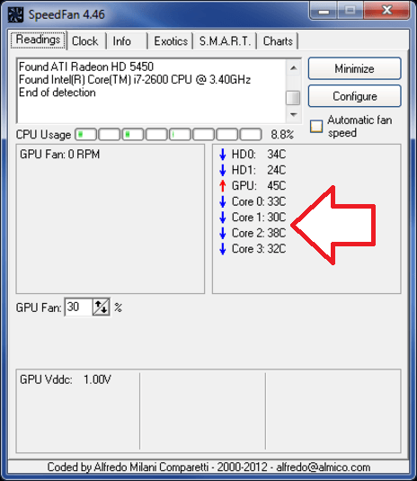 SpeedFan это программа, разработанная в первую очередь, для наблюдения за кулерами. Но, при желании, вы можете использовать ее для того чтобы проверить температуру процессора, видеокарты и жестких дисков.