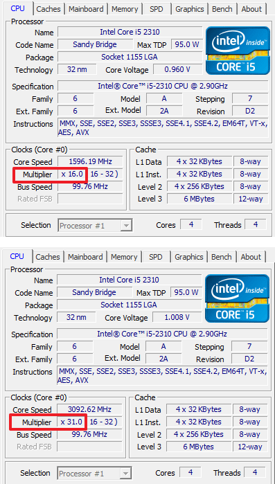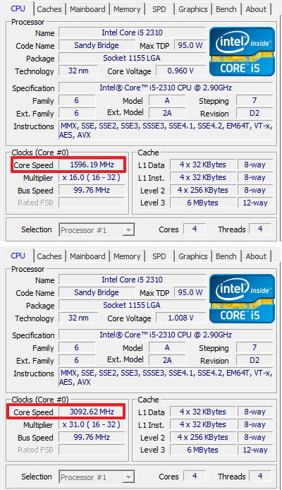 Внизу показаны скриншоты из программы CPU-Z. Там видно, как частота процессора Intel Core i5 2310 скачет между значениями 1600 МГц и 3100 МГц.