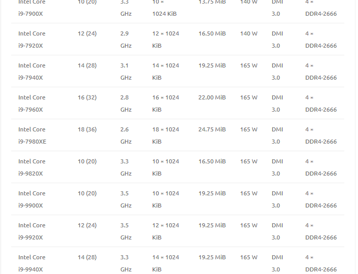 | Intel Core i9-9980XE | 18 (36) | 3 GHz | 18 × 1024 KiB | 24.75 MiB | 165 W | DMI 3.0 | 4 × DDR4-2666 |