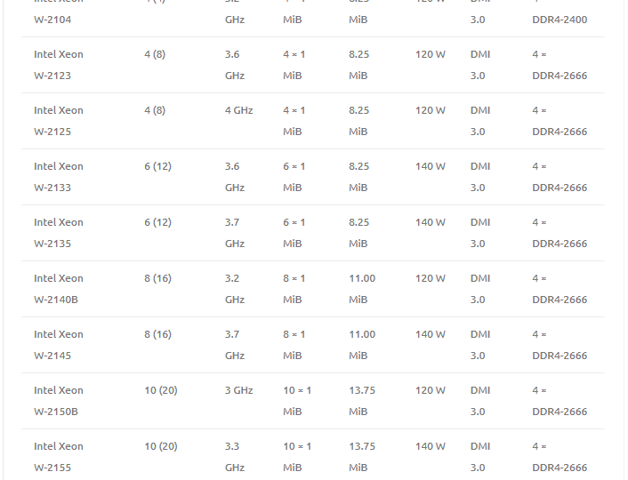 | Intel Xeon W-2190B | 18 (36) | 2.3 GHz | 18 × 1 MiB | 24.75 MiB | 140 W | DMI 3.0 | 4 × DDR4-2666 |