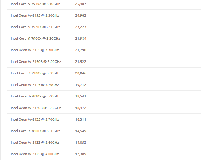 | Intel Xeon W-2195 @ 2.30GHz | 24,983 |