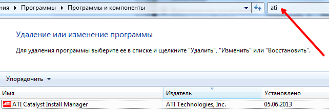 После открытия раздела «Удаление программы» перед вами откроется список всех программ, которые вы установили на свой компьютер. Для того чтобы найти здесь драйвер от видеокарты AMD Radeon введите в поиск слово «AMD» (если у вас старая версия драйвера, то в поиск нужно вводить слово «ATI»).
