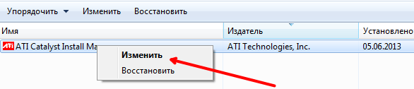 После использования поиска в списке приложений должен остаться только ваш драйвер от видеокарты. Кликните по нему правой кнопкой мышки и выберите пункт «Изменить».