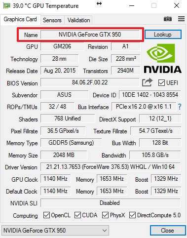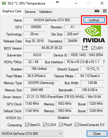 В правом верхнем углу окна есть кнопка «Lookup». Если нажать на нее, то откроется веб-страница с характеристиками видеокарты на сайте https://www.techpowerup.com. Таким образом можно быстро узнать полное название видеокарты, которая установлена в компьютере.