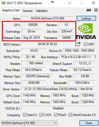Чуть ниже название графического чипа (GPU), а также его основные характеристики (ревизия, техпроцесс, размер кристалла, дата выхода, количество транзисторов).