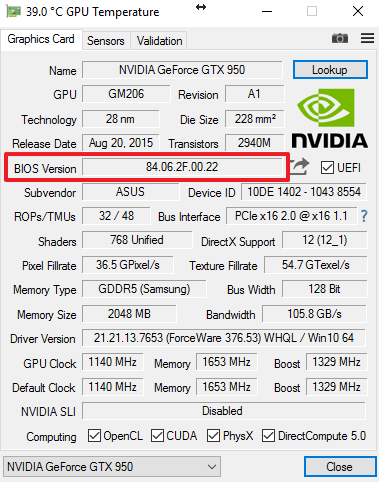 Дальше указывается версия BIOS видеокарты. Нужно отметить, что BIOS видеокарты это не тоже самое что BIOS материнской платы. У видеокарт есть свой собственный BIOS, никак не зависящий от BIOS материнской платы.