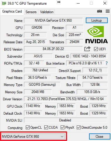 В самом низу есть выпадающий список видеокарт. Если в системе используется больше одной видеокарты, то с помощью данного выпадающего списка можно переключаться между разными видеокартами и просматривать их характеристики.