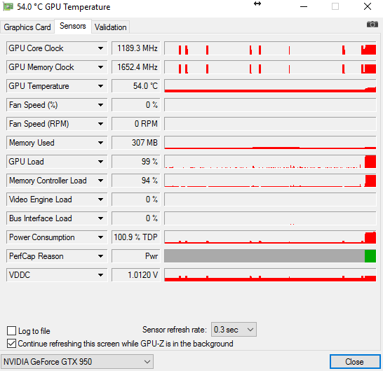 При необходимости характеристики видеокарты из вкладки «Sensors» можно сохранить в текстовый файл. Для этого нужно активировать функцию «Log to file».