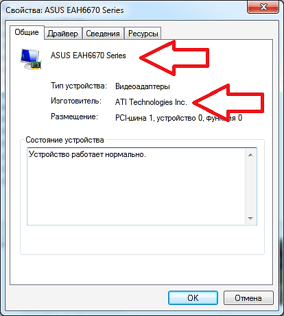 После этого перед вами должно появиться окно со списком установленных устройств. Здесь нужно нужно найти раздел «Видеоадаптеры», кликнуть правой кнопкой по названию видеокарты и открыть «Свойства». В открывшемся окне вы сможете увидеть название видеокарты и ее производителя. В нашем случае это видеокарта Asus EAH6670 Series и производитель ATI Technologies.
