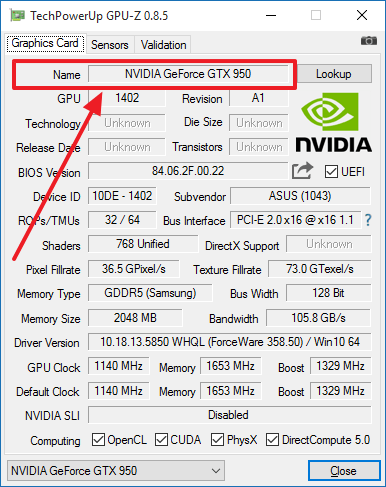 После запуска GPU-Z вы увидите небольшое окно с подробной информацией о вашей видеокарте. В верхней части этого окна есть текстовая строка «Name», здесь указывается название установленной видеокарты. В данном случае, на скриншоте указана видеокарта NVIDIA GeForce GTX 950.