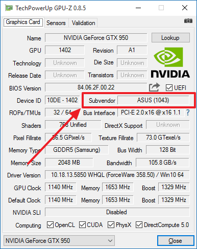 Чуть ниже, в текстовом поле «Subvender», указывается производитель видеокарты. В данном случае это ASUS. Если в вашей системе установлено несколько видеокарт, то вы можете посмотреть информацию о каждой из них. Для этого нужно воспользоваться выпадающем списком, который расположен в нижней части окна GPU-Z.