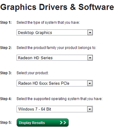 После того как мы определили модель и производителя видеокарты можно приступать к поиску драйвера для нашей видеокарты. Если у вас видеокарта от ATI/AMD то переходим по этой ссылке и заполняем форму для поиска драйвера.