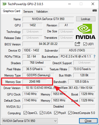 Запустите программу GPU-Z на своем компьютере и обратите внимание на строку «Memory Size». Значение данной строки это и есть объем видеопамяти на вашей видеокарте.