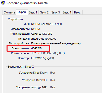 На скриншоте выше видно, что «Средства диагностики DirectX» указывает объем памяти видеокарты 6047 мегабайт, хотя на самом деле объем памяти составляет всего 2048 мегабайт.