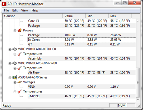 Программа HWmonitor отображает температуру видеокарты в Цельсиях и Фаренгейтах. Указывается три температуры: текущая, минимальная и максимальная. Это очень удобно для тестирования.