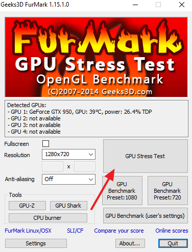 Для того чтобы провести стресс тестирование видеокарты с помощью FurMark, вам нужно зайти на официальный сайт данной программы, скачать последнюю версию и установить на свой компьютер. Дальше запускаем установленную программу и видим окно, как на скриншоте внизу. В принципе можно не менять никаких настроек и сразу запустить стресс-тест. Для этого нужно нажать на кнопку «GPU Stress Test».