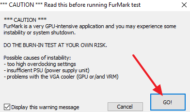 После этого появится окно с предупреждением о том, что программа FurMark создает очень интенсивную нагрузку на видеокарту и что это может привести к нестабильности и перезагрузке системы. Также здесь говорится что вы делаете все на свой страх и риск. Для продолжения стресс тестирования нажимаем на кнопку «Go!».