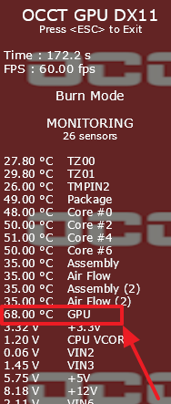 После появления бублика нужно наблюдать за температурой видеокарты. Это можно делать с помощью таблицы с параметрами системы, которая выводится слева от бублика.