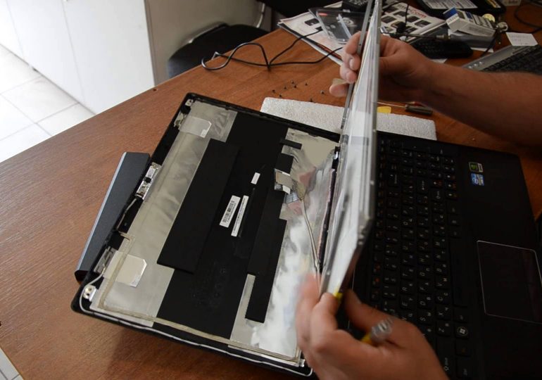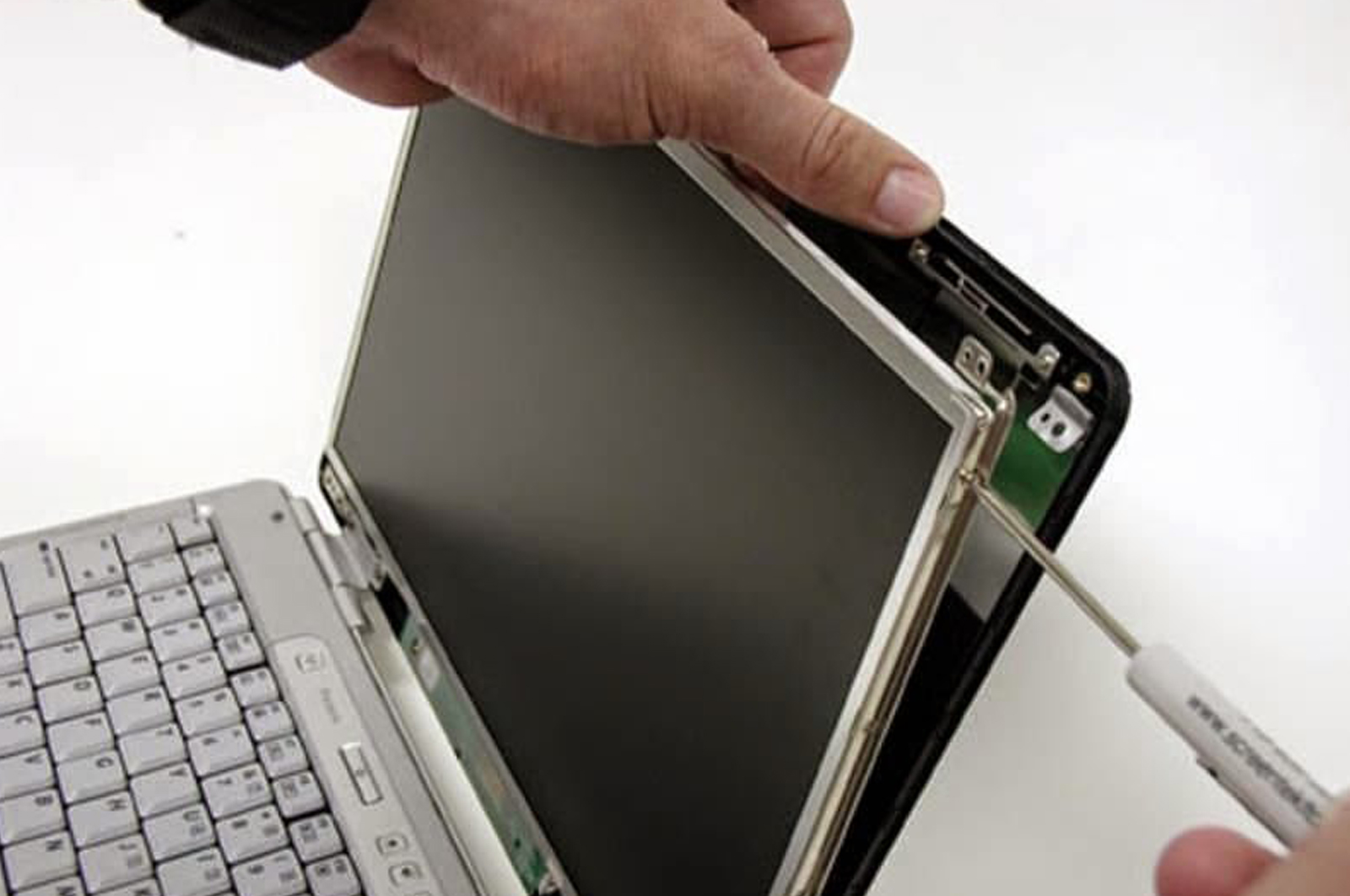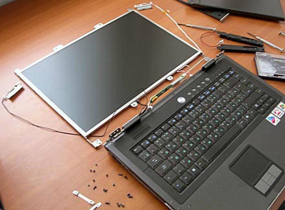 Разобрав ноутбук, откручиваем винты, которыми экран крепится к основанию. Следующий этап снова зависит от модели ноутбука — разборка крышки экрана может быть как элементарной, так и довольно сложной процедурой. Нам же необходимо извлечь из нее поврежденную матрицу.