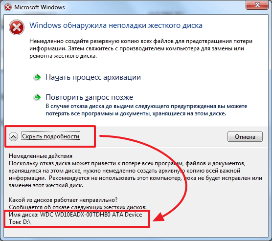Если на вашем компьютере больше одного жесткого диска, то первое, что нужно сделать, это определить какой жесткий диск выходит из строя. Для этого нажмите на кнопку «Показать подробности» в окне с сообщением о неполадках жесткого диска. В самом низу окна должна быть информация о диске.