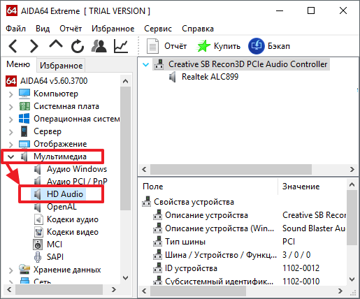 Итак, скачайте программу AIDA64, установите и запустите на своем компьютере. После этого откройте раздел «Мультимедиа – HD Audio». В этом разделе будет отображаться информация о вашей звуковой карте.