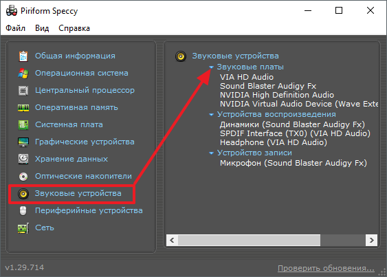 Еще один способ узнать, какая звуковая карта стоит на компьютере, это программа Piriform Speccy. В отличие от AIDA64, данная программа полностью бесплатна.