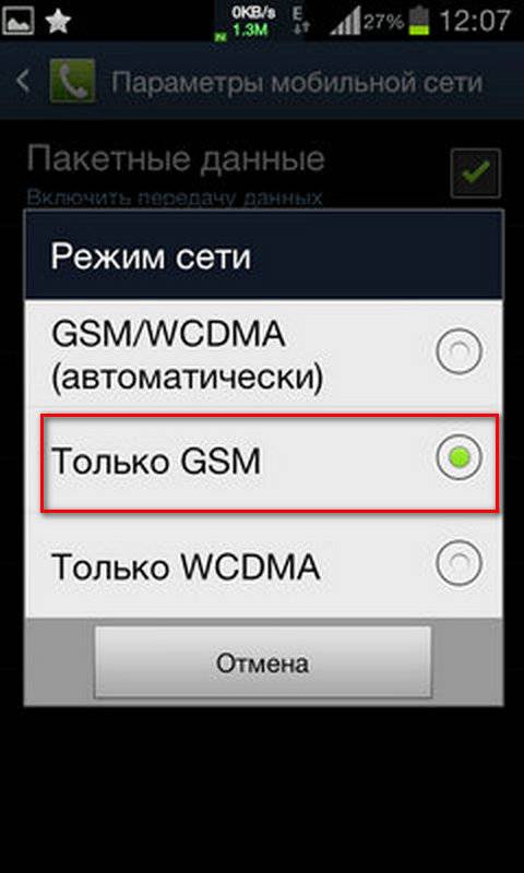 - в открывшемся окне установим флажок напротив опции «Только GSM» или «Только сети 2G».