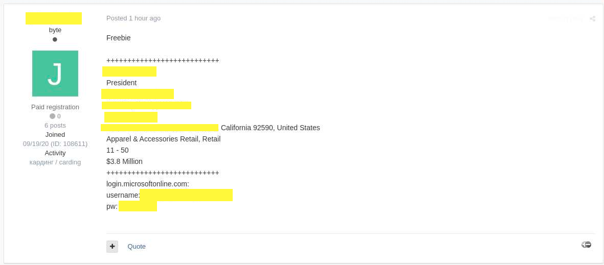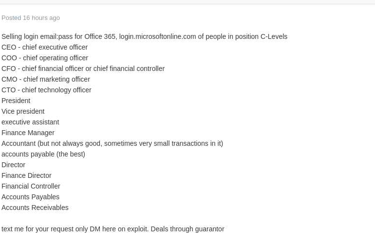 Злоумышленник продает комбинации адресов электронной почты и паролей для учетных записей Office 365 и Microsoft, которые, как он утверждает, принадлежат руководителям высокого уровня, в том числе гендиректорам, главным операционным директорам, финансовым директорам, директорам по маркетингу, техническим директорам, президентам компаний и их замам и помощникам, финансовым менеджерам, бухгалтерам.