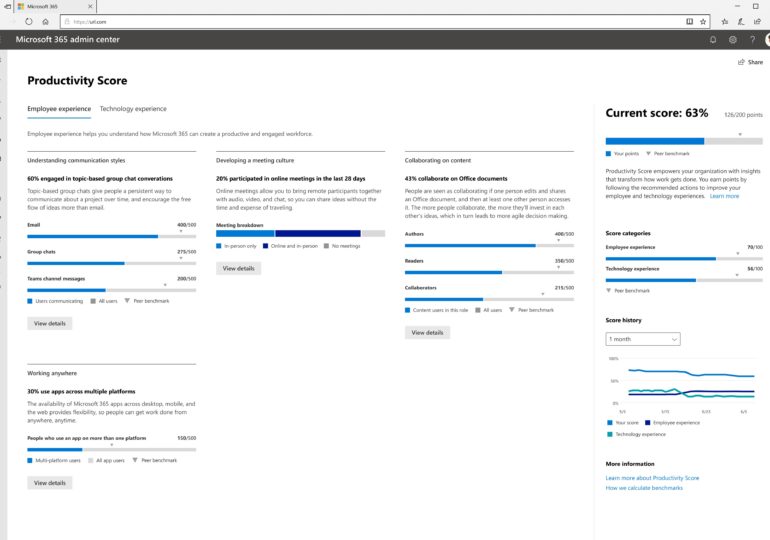 Productivity Score учитывает, насколько регулярно сотрудник включает камеру во время онлайн-совещаний, как часто он отправляет электронные письма или добавляет комментарии в документы и чаты, а также сколько дней он использует Word, Excel, Teams, Outlook и Skype в течение последнего месяца. Служба создаёт на основе этих данных графики и суммирует метрики с «технологическим опытом» — качеством интернет-соединения, временем загрузки, используемым софтом и другими параметрами. Конечный балл можно сравнить с показателями других компаний, а в самой программе есть вкладка с рекомендациями, где указано, как следует научить сотрудников лучше пользоваться программами Microsoft 365.