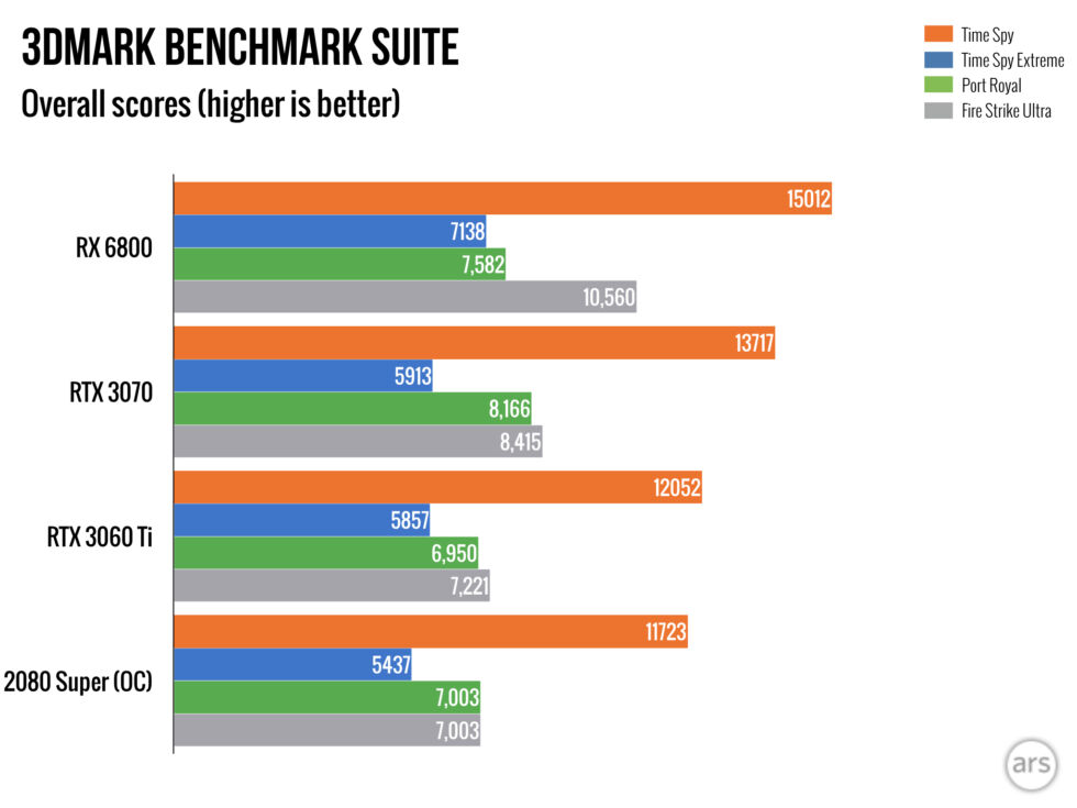 Издание Ars Technica протестировало новую видеокарту в бенчмарках и нескольких играх. Так, в Time Spy RTX 3060 Ti показала 12052 балла в обычном режиме и 5857 баллов в режиме Extreme. Она обошла предшественницу RTX 2080 SUPER, которую к тому же разогнали с помощью программы EVGA X1 (11723 и 5437 баллов соответственно).