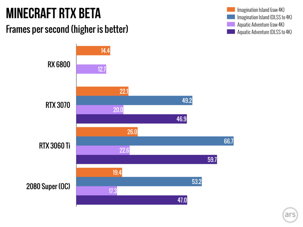 В играх преимущество 3060 Ti ещё заметнее: в Minecraft при 4K-настройках графики видеокарта обеспечила 26 кадров в секунду в локации Imagination Island, в то время как 2080 SUPER при тех же настройках выдавала 19,4 кадра.