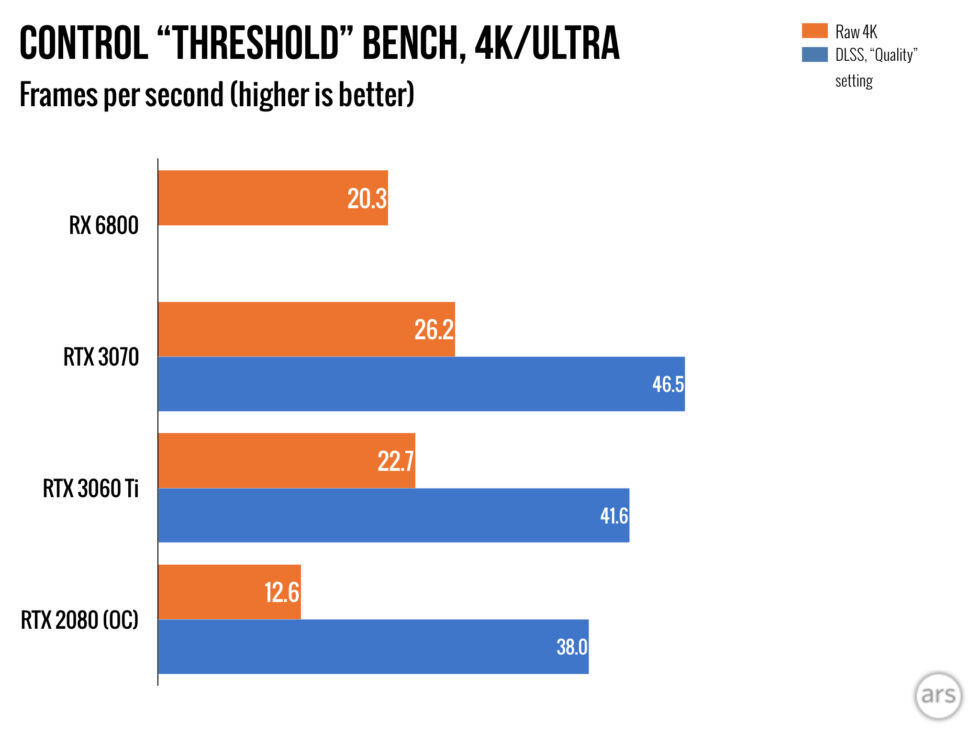 В игре Control новой карте удалось и вовсе в два раза побить старую — 22,7 кадра в 4К против 12,6 кадра у 2080 SUPER.