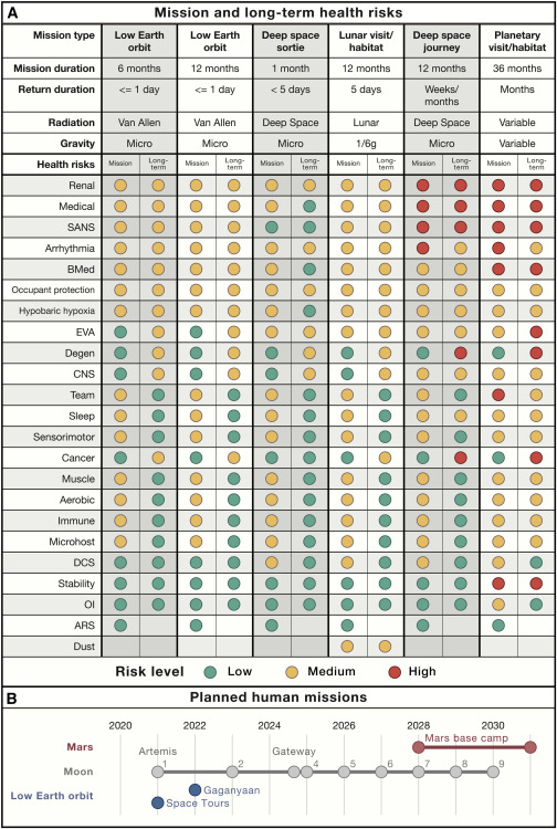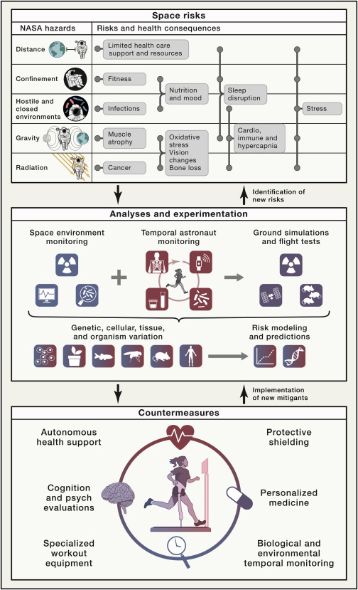 Кроме того, существует ряд различных уровней гравитации, которые будут испытывать космические путешественники, например, на Луне (1/6 гравитации Земли) и Марсе (1/3). А при спуске через атмосферу часто возникают интенсивные силы, во много раз превышающие силу тяжести (в 3–6 раз). Микрогравитация вызывает клеточные и молекулярные адаптации и изменения в геноме, эпигеноме, а также протеоме, и эти изменения создают вероятность развития патологий. На уровне организма жидкости, в том числе кровь, смещаются вверх к голове и грудной клетке, что приводит к уменьшению снабжения ног и компенсаторному изменению сердечно-сосудистой системы. Кости и мышцы атрофируются в результате процессов ремоделирования.