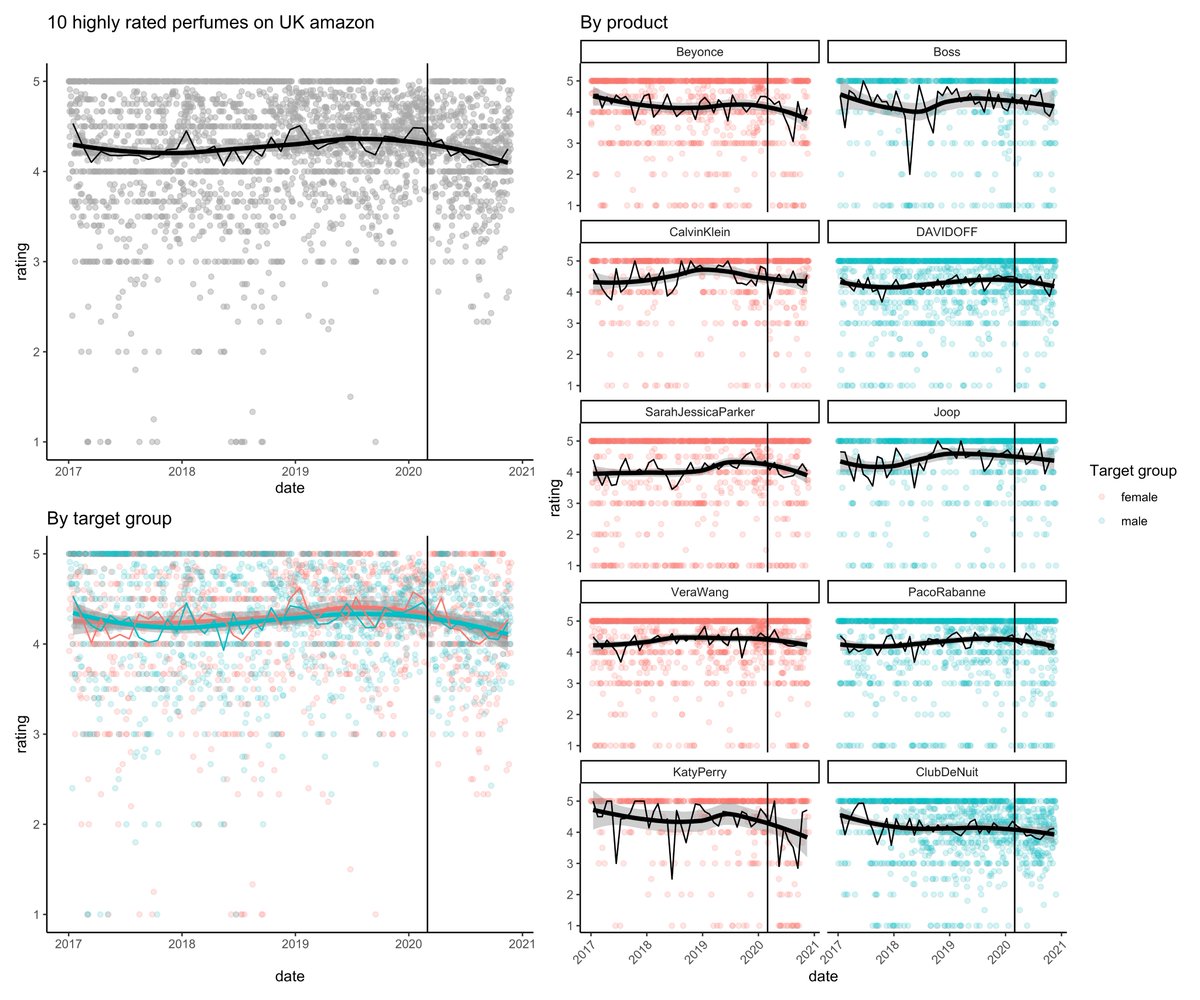 Аналогичная статистическая выкладка Морица Вагнера, аспиранта Лондонской школы гигиены и тропической медицины, касалась парфюмов на Amazon.co.uk и также выявила похожий тренд. У десяти самых популярных дух́ов средняя оценка упала, но не так заметно.