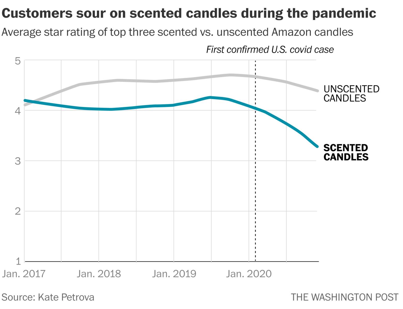 Отзывы покупателей трёх самых популярных продавцов ароматических свечей американской площадки Amazon.com подтвердили наблюдение. С января 2017 по январь 2020 года средний рейтинг колебался в районе 4,3 — 4,5, но затем пошёл на спад.