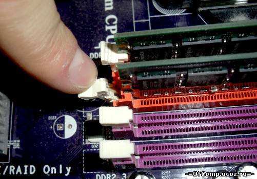- RAM нужно вставить таким образом, чтобы паз точно совпал с выступом, размещенным в разъеме;