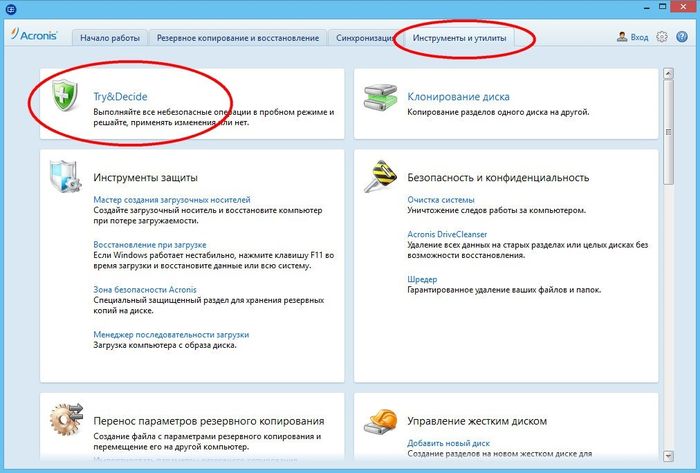 Такую возможность дает Try&Decide — утилита, входящая в состав Acronis True Image, включая редакцию 2014. В версии 2015 эта полезная функция, к сожалению, была удалена разработчиками, что вряд поспособствует популярности их некогда знаменитого продукта, но будем ближе к делу. Try&Decide позволяет устанавливать нестабильное и потенциально опасное ПО, обновления и драйвера, открывать подозрительные электронные письма, посещать сомнительные сайты без риска для системы и потери данных. В случае сбоя или заражения вирусами, виртуальное пространство можно будет удалить при перезагрузке компьютера.