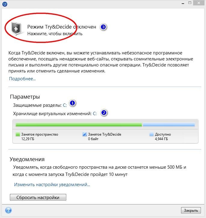 Но, как и все средства виртуализации, Try&Decide имеет свои недостатки. Выполнение таких операций с дисками и разделами как изменение размера, типа файловой системы, сжатия с целью получения нераспределенного пространства и т.п. недопустимы, так как пробный режим не отслеживает подобные изменения. Настоятельно не рекомендуется выполнять дефрагментацию или проверку защищенного тома или тома, на котором расположена виртуальная область, — это может привести к повреждению файловой системы. Кроме того, функции «Непрерывная защита» и «Восстановление при загрузке» в пробном режиме работать не будут. Также готовьтесь к тому, что при каждой перезагрузке с сохранением режима Try&Decide дисковое пространство будет уменьшаться на 500 Мб.