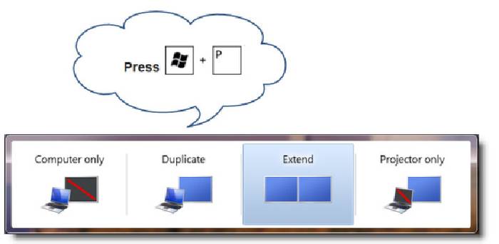 Для начала настройки работы двух экранов в Windows 7 необходимо нажать Win+P. Откроется окно, в котором можно просто выбрать необходимый режим работы. Данный способ подходит только в том случае, если оборудование автоматически определилось и установилось.