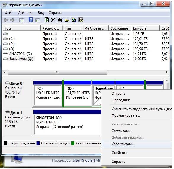 - в окне «Управление дисками» нужно выбрать носитель D и выбрать «Удалить том»;