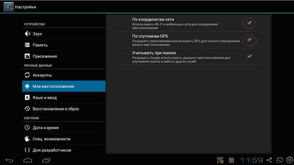 - затем необходимо в настройках Android разрешить доступ к геоданным. Для этого необходимо в настройках смартфона выбрать вкладку «Местоположение» и, перейдя по ней, поставить галочки на следующих пунктах: «По координатам сети» и «По спутникам GPS»;