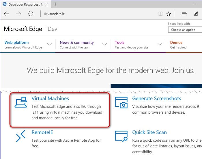 Для скачивания готовой виртуальной машины открываем сайт Modern.IE и переходим в раздел Virtual Machines.