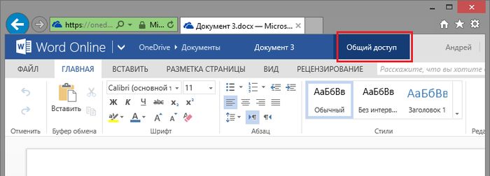 Чтобы начать совместную работу над документом, вам следует перейти по указанному выше адресу и выбрать свое приложение. Также вы можете перейти на сайт OneDrive и открыть существующий документ. Открыв документ, нажмите на кнопку «Общий доступ» в верхней правой части страницы (аналогичная кнопка есть и в меню «Файл»).