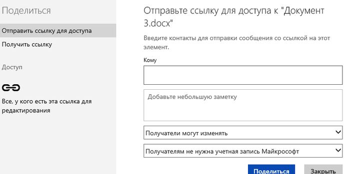 После этого в поле «Кому» введите адреса электронной почты тех людей, которым вы хотите предоставить доступ к документу, и выберете необходимые разрешения – редактирование документа или только просмотр, и понадобится ли для этого учетная запись Microsoft.